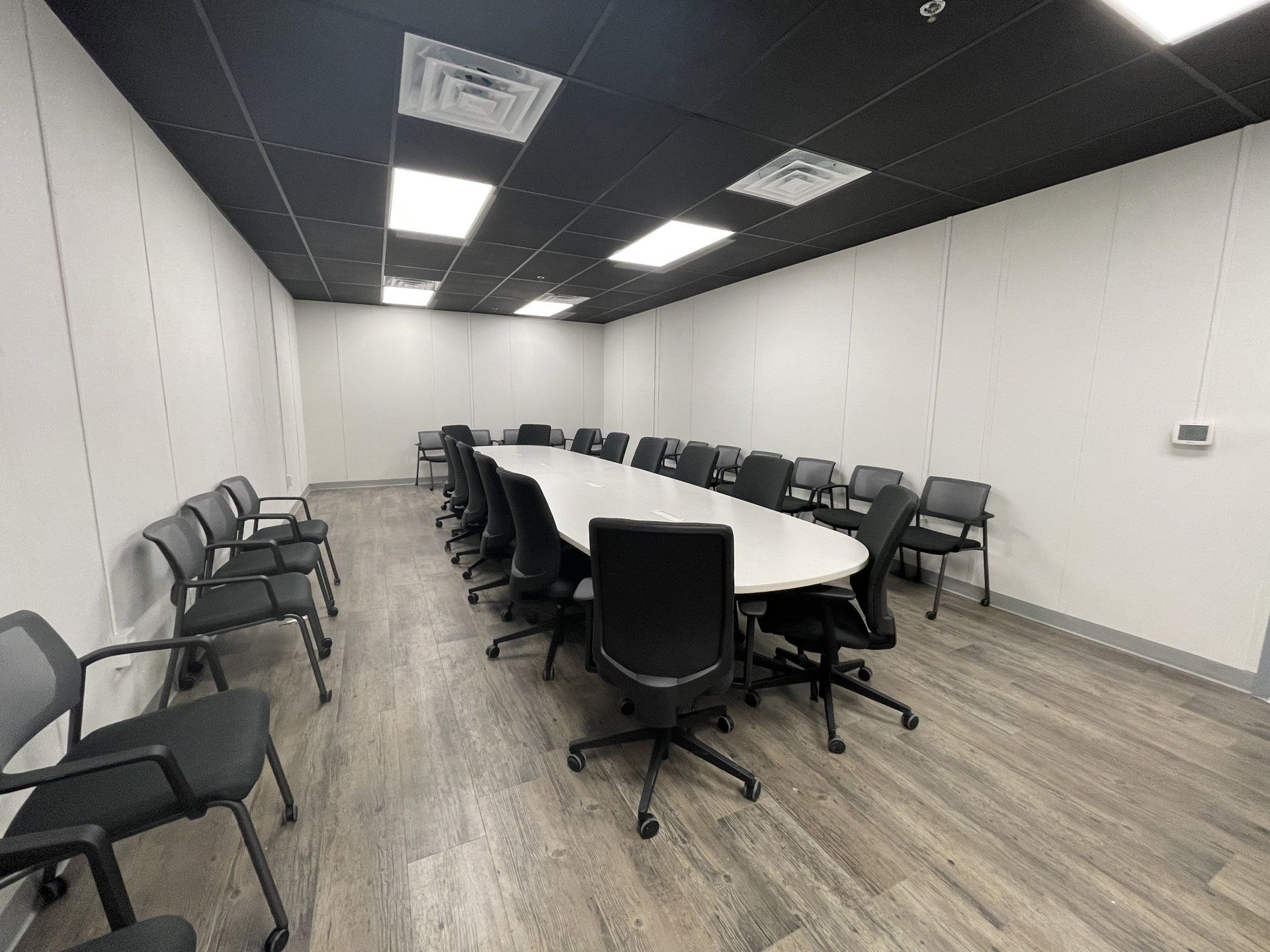 The floor plan includes a common corridor, multiple sub-compartmentalized office blocks with open floor offices and private offices, multiple conference rooms, block comm rooms, a main comm room, a secure entry, men’s and women’s restrooms, shared break area, mother’s room, storage, riser room and electrical room.