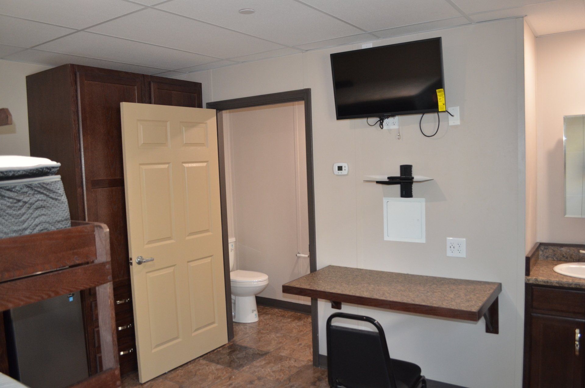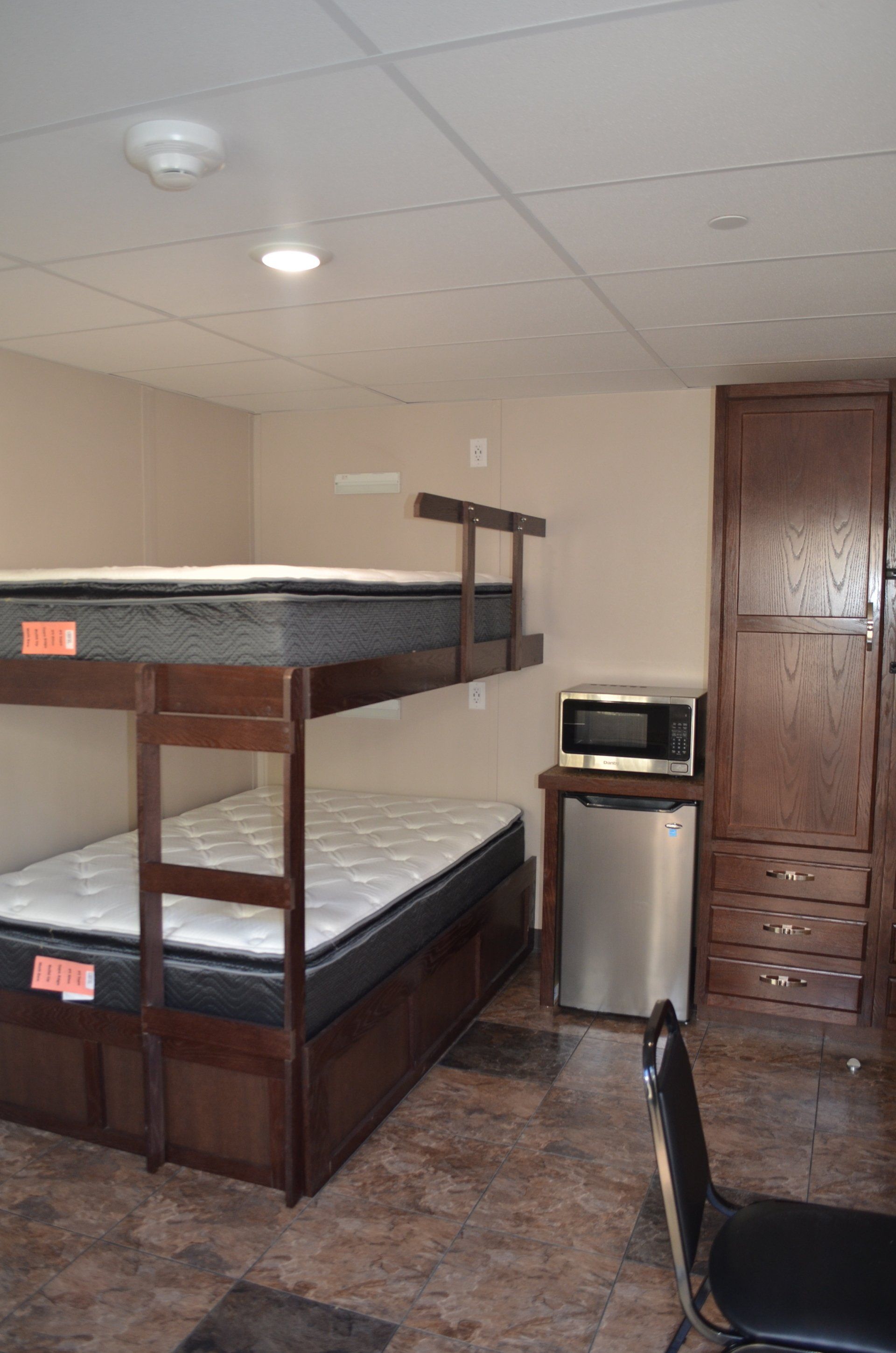 The campus is adjoined by decking to the existing 300 person temporary dorm project, and includes 9 (14x76) dorm buildings. Each building has 5 rooms that are approximately 150 SF and accommodates 2 persons per room. Each room is equipped with 2 twin beds, built-in furniture, television, microwave, mini-fridge, and a bathroom per unit.